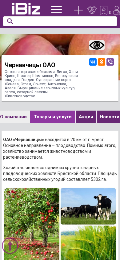 | AI-анализ | --- This website represents Chernavchicy OAO, an apple trading company based in Chernavchiцы Agricultural Association, Brestskaya, 55, 225030, Belarus. The company specializes in the sale of apples under various brands such as Лигол, Хани Крисп, Шостер, Шампиньон, Белорусская сладкая, and Голден. They also offer super early apple sorts including Женева, Страд, Эрнест, Антоновка, and Алеся. Apart from apple trading, the company is engaged in grain cultivation, rapeseed farming, and sugar beet cultivation, as well as livestock farming. The website provides information on company acquisitions, news, job vacancies, and video content. Chernavchicy OA |