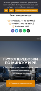 | AI-анализ | language: ru The web project "Povezet.by" is a cargo transportation company based in Minsk, Belarus, offering services for the transportation of goods up to 5 tons at affordable prices, starting from 30 rubles. The company operates 24/7 and can be reached via multiple contact options including phone numbers for MTS and A1, Viber, Telegram, Whatsapp, Instagram, and an option for a callback. The website includes sections for the company, services, tariffs, payment methods, cooperation, and contacts. The main focus of the company is on cargo transportation within Minsk and Belarus, with a professional team and a fleet of vehicles of various sizes and capacities. The company prides itself on providing quality services, from the initial phone call to the final delivery. The services are universally applicable, including transportation of household appliances and other items, |