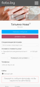 | AI-анализ | This online resource is a photography website featuring the work of photographer Tatiana Nova from Mogilev, Belarus. The website offers photographs in the category "Фотосъемка новорожденных" (newborn photography). Tatiana Nova specializes in various types of photography sessions including child and family, as well as newborn photography. She works in the cities of Mogilev, Minsk, Brest, and Gomel. The website includes a catalog of photographers, community for photographers, blog, announcements, and a contact section. Users can write messages, leave reviews, and view prices and conditions for services. The website is accessible in both Russian and Belarusian languages. The photographer's portfolio includes 67,634 photographs in the newborn photography category. Tatiana Nova's contact information includes a phone number and personal website. |