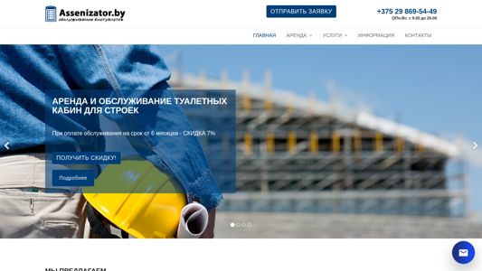 | AI-анализ | This website provides rental, maintenance, and sales of outdoor portable toilets in Minsk. The title and description keywords include 'rental', 'obsluzhivanie' (servicing), 'bioutaelotov' (portable toilets), 'kabiny' (cabins), 'uslugi' (services), and 'minsk'. The website offers services for construction sites, events, and showers, as well as garbage containers, cleaning services, and personnel for events. The website mentions discounts for long-term rentals, and provides contacts for making a reservation. The domain name is assenizator.by. |
