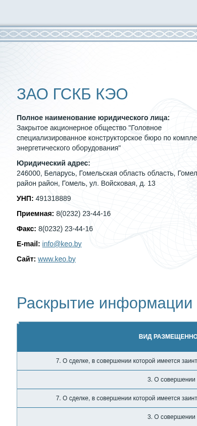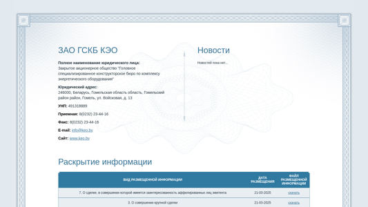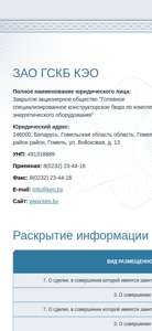 This website is for the "Головное специализированное конструкторское бюро по комплексу энергетического оборудования" (GSKB KEO), a closed joint-stock company registered in Belarus. The company's legal address is in the city of Homel, on Voiskova Street. The website provides access to information on major deals and the formation of shareholder registers, some of which involve affiliated parties. Users can access a personal cabinet using an email address and password. The website was developed by epfr.by.