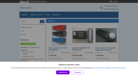 | AI-анализ | The website "ООО "Коминтэлтех"" is an e-commerce platform selling various products and services from the company of the same name. The website provides contact information, a list of their offerings, and prices. The company's products include a digital code key, a doorphone, an impulse power supply, a controller, a reader, a push button, and a universal controller, all available only in bulk. The website also mentions that some items are expected to be in stock soon. The company's contact information includes phone numbers for both Belarusian and international calls, and a physical address in Minsk, Belarus. The website is registered under the Belarusian .BY domain and was created using the Deal.by platform. The use of cookies on the site is mentioned. |