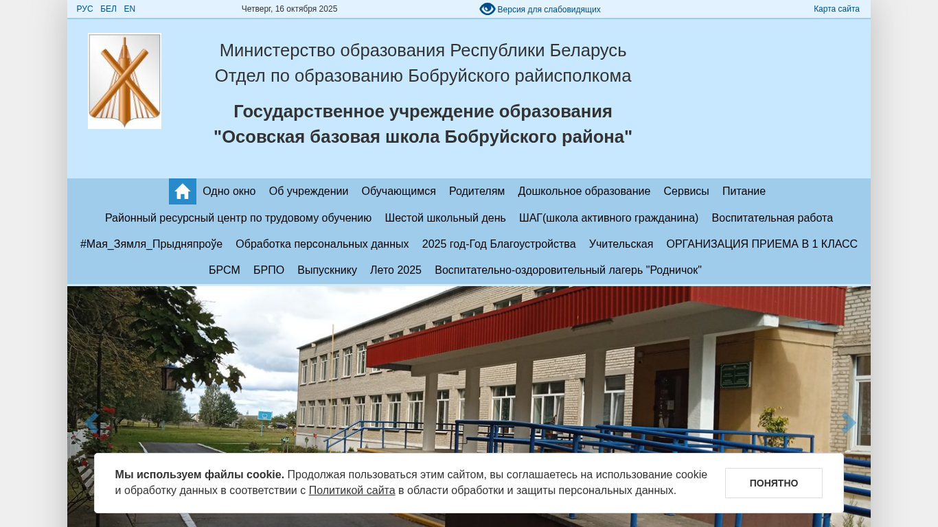 | AI-анализ | The website is for Осовская базовая школа Бобруйского района (Osvoskaya Bazovaia Shkola Bobruyskogo Raiona, or Osvoskaya Base School of Bobruysk District), a school located in Belarus. The title and description suggest that it is a base or comprehensive school. The keywords include words related to education, work, and the district of Bobruysk. The top words indicate that there may be information about the school schedule, news, and dining. The website uses the .BY domain for Belarus. |