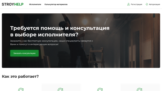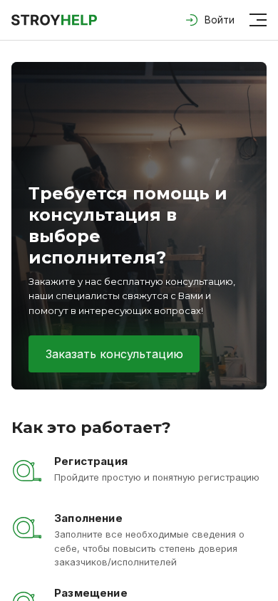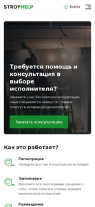 | AI-анализ | --- The portal Stroihelp is a Belarusian website providing consulting services for those in need of assistance in choosing contractors for various repair and construction projects. The site offers a free consultation service and features a calculator for estimating material costs. Visitors can also register and create a profile to place and receive offers for their projects, as well as search for contractors based on their specialization. The site includes sections for contractors, a calculator for materials, authorization and registration, and a FAQ section with answers to common questions. Popular categories of work include repairs, home building, engineering, and projects. Users can also download a template contract for their services. |