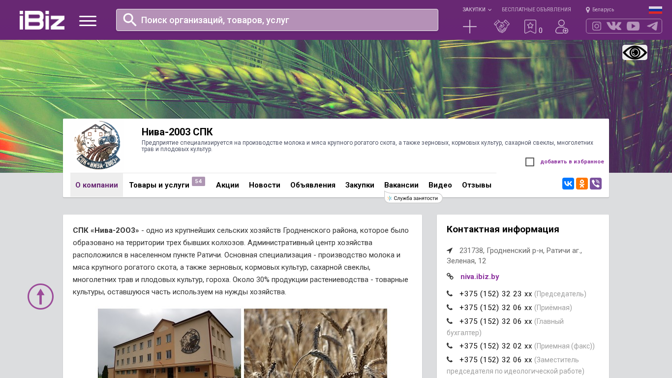 | Название / Заголовок | Нива-2003 СПК - Предприятие специализируется на производстве молока и мяса крупного рогатого скота, а также зерновых, кормовых культур, сахарной свеклы, многолетних трав и плодовых культур.. 231738, , Ратичи аг., Зеленая, 12 |