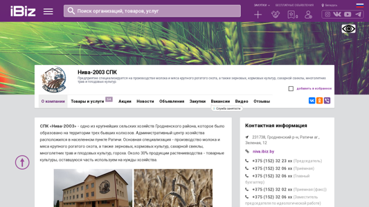 | AI-анализ | This online resource is dedicated to Niva-2003 SPK, a Belarusian enterprise specializing in the production of milk and meat from large cattle, as well as grains, forage crops, sugar beets, perennial plants, and fruit trees. The company is located at 231738, Ratiche Ag., Zelenaya, 12, and provides information on its products and services in the fields of agriculture, livestock farming, and agriculture-related activities. Keywords associated with the website include 'cultivation', 'production', 'grains', 'livestock', and 'agriculture'. The website also offers announcements for purchases, news, vacancies, and videos related to the company. Niva-2003 SPK is one of the largest agricultural businesses in the Grodno region, with an administrative center in the village of |