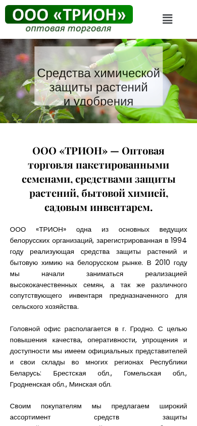 | AI-анализ | The website is for OOO "Trion," a Belarusian company specializing in the optic sale of plant protection products, seeds, and household chemicals. Established in 1994, Trion is one of the leading organizations in Belarus for the distribution of these items, with offices and warehouses in various regions including Brestskaya oblast, Homelskaya oblast, Hrodna oblast, and Minskaya oblast. The website offers a wide range of products, including plant protection chemicals and fertilizers, packaged seeds, rodent and insect control, and gardening tools. The company aims to meet the demands of discerning customers with a constantly evolving product line. The head office is located in Hrodna. |