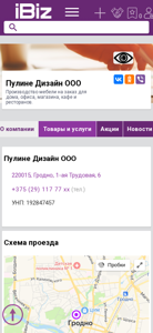 | AI-анализ | The web project "Puline Design OOO" is a Belarusian company based in Grodno, producing custom-made furniture for homes, offices, stores, cafes, and restaurants. The website provides company information, details on their products and services, and contact information, including a phone number and address at 1-ая Трудовая, 6 in the 220015 postal code area. The company is open for business Monday through Friday from 9:00 AM to 6:00 PM, with no breaks for lunch. The site also includes a map for easy navigation. |