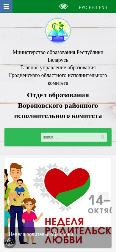 This website is the educational department of the Voroновsky district executive committee in Belarus. It provides information about various educational events and initiatives taking place in the district, including a week dedicated to parental love and support, a day celebrating teachers, and a meeting with veterans of pedagogical work. The website also mentions a methodical service in education that has existed for 25 years and a regional parent meeting on moral and ethical values. Additionally, there are announcements for a pro-orientation meeting with a border guard representative and news from the region and the 'Molodzhest' (Youth for Safety) initiative. The site includes a calendar of events with dates and brief descriptions.