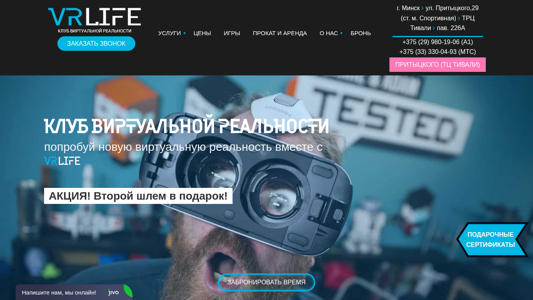 | AI-анализ | The website VRLIFE is a virtual reality studio or park located in the center of Minsk, Belarus. It offers rental and attendance for various events. The website mentions HTC Vive and PlayStation as virtual reality technologies used in their offerings. There are multiple gaming zones, including auto simulators and PlayStation 5, with various pricing options available for rental periods ranging from 15 minutes to 2 hours. The website also mentions an ongoing offer for a free second VR headset for bookings before 17:00 during weekdays, valid until October 31, 2025. The website includes a blog and contact information, with locations at TS Tivali Pav. 226A and phone numbers for A1 and MTS networks. |
