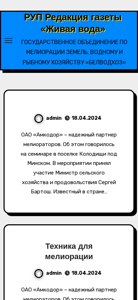 | AI-анализ | This website belongs to the administrative division of the state enterprise "Belvodkhoz" for the publication of the newspaper "Living Water" (Живая вода). The website provides information about the enterprise, its activities, and partnerships, including an event where the Minister of Agriculture and Food participated and spoke about the reliable partnership with OAO "Amcorod" for providing equipment for melioration. The website also mentions the participation of various general directors and project leaders in a council meeting, and the awarding of the title of "Honorary Citizen" to a veteran of labor in a ceremony held in Petrikovsky District. Additionally, there is a mention of the first season of operations for a filial of OAO "Pinskvodstroy" by Daniil Tarasovets, who graduated from an agricultural college with a specialization in operating an excavator and driving |