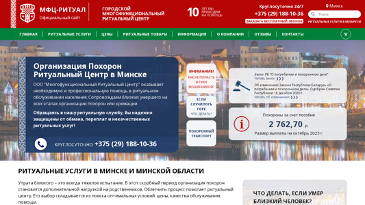 | AI-анализ | The website is the official site for the Multi-Functional Ritual Center in Minsk, Belarus, offering quality ritual services for funerals and other purposes. The center provides a full range of services including funeral organization, funeral agent, transportation of the deceased, cremation, VIP funerals, rental catafalque, mourning services, toilet for the deceased, and a ritual shop for purchasing funeral items such as wreaths, coffins, and urns. Services are available 24/7, and customers can place a free call to inquire or make arrangements. The site also features sections for pricing, information on funeral procedures, and company background. |