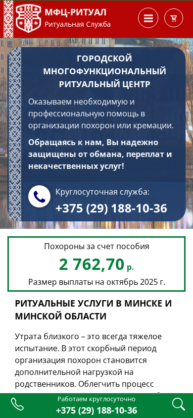 | SEO-описание | Городской ритуальный центр предлагает качественные ритуальные услуги в Минске и Беларуси. Честные цены на организацию похорон. Бюро ритуальных услуг полного цикла и любой сложности. Фирма оказывает полный спектр услуг. Оплата по договору. ☎ Звоните 7695! |