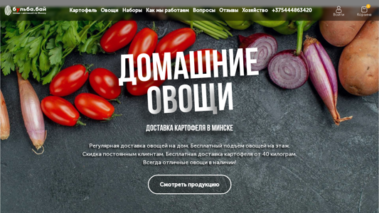 | AI-анализ | --- This website is an online grocery store based in Minsk, Belarus, specializing in the sale and delivery of potatoes (carrots, beets, onions) with regular subscription options. The homepage features information about the availability of the 2025 potato harvest, with prices starting at 70 copecks per kilogram. The store also offers other vegetables such as carrots, beets, and onions, with the option to call +375 44 486 34 20 for more details. The website includes sections for 'Our Products', 'How We Work', 'FAQs', 'Testimonials', and 'Our Farm', and offers regular delivery with free delivery for orders over 40 kilograms. The store promises high-quality produce and operates in Minsk. |