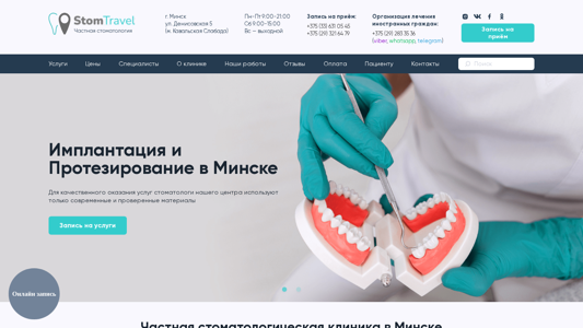 | AI-анализ | The portal Stomtravel.by is a private dental clinic website based in Minsk, Belarus, located at Denisovskaya 5, Kavalanskaya Sloboda Metro Station. The clinic offers a wide range of dental services using modern equipment. Services include prosthetics, consultation with an orthodontist, crown installation, E-max, ceramic, metal, and temporary crowns, non-removable prosthetics, bridgework, dental veneers, and various implantation systems such as Straumann, All-on-4 and All-on-6, Megagen, Osstem, and Korean zirconium implants. Additionally, the clinic provides therapy, tooth whitening, and various other dental procedures. Patients can book appointments by calling +375 (33) 631 05 45 or + |
