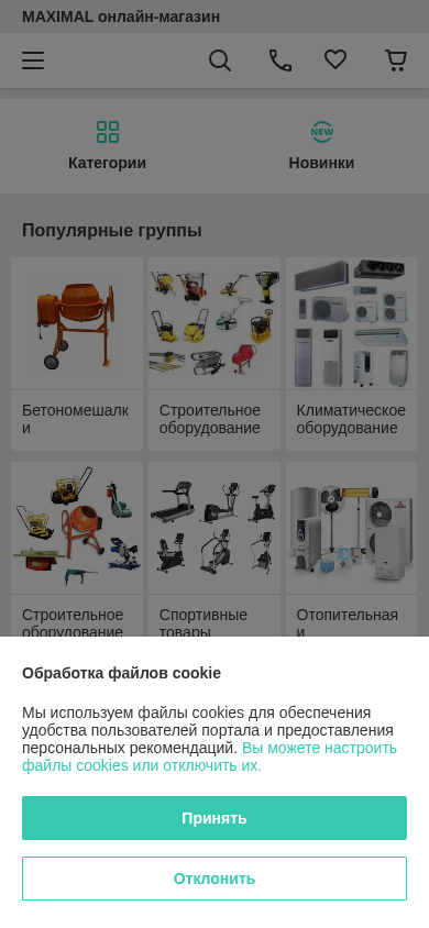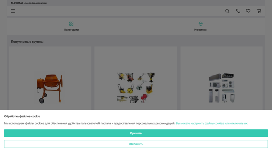 The web project "MAXIMAL онлайн-магазин" is an online store offering a wide range of various products at affordable prices. It provides free delivery, consultations, and guarantee commitments. The website accepts different forms of payment and features ongoing promotions and gifts. Products include building machinery, climatic equipment, sports items, and heating and climate technology. The homepage displays popular items such as a HYUNDAI L5362S lawnmower, an Eco GD-52 motoburner, a bensi-naive Eco LG-532 lawnmower, and an Eco LG-633 lawnmower. Other items include a Skiper C-90 vibrating plate, a compact Alpin Reise T-183 running track, and more. The website also includes sections for 'About Us', 'Contacts',