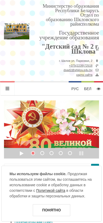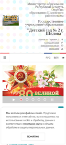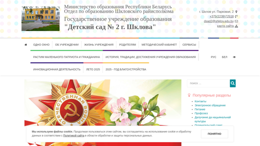 | AI-анализ | This website belongs to the "Детский сад 2 г.Шклова" (Child Care Center No. 2 in Shklov), a state educational institution located in Shklov, Belarus. The website contains information about the kindergarten's schedule, administration hours, admission procedures, and various services offered such as social-pedagogical support, psychological assistance, food services, and more. Additionally, it includes contact information, a map of the site, and a virtual tour. The website uses cookies and visitors agree to their usage and data processing according to the site's privacy policy. The Ministry of Education of the Republic of Belarus and the Shklov District Executive Committee are among the higher-level organizations mentioned. The site also features various forms and methods of working, as well as a project titled "Растим маленького патриота и гражданина" |