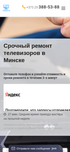 | AI-анализ | --- The web project tv-service.by is a website dedicated to TV repair services in Minsk, Belarus. The website claims to repair over 85% of TVs within a day. The homepage includes sections for the company, pricing, brands, customer reviews, and contacts. The website offers a quick repair estimate and a guarantee on all types of repairs for up to three years. The main repair services include fixing issues with power sources, control boards, TV tuners, system plates, and screens. Common problems like no power or no signal are also addressed, as well as repairs for the power supply block, control panel, and remote control. The website states that their specialists, with years of experience and certified qualifications, can repair TVs both at home and in the workshop, and they work with all TV manufacturers. The site also offers a 20% discount for services booked through the website and a |