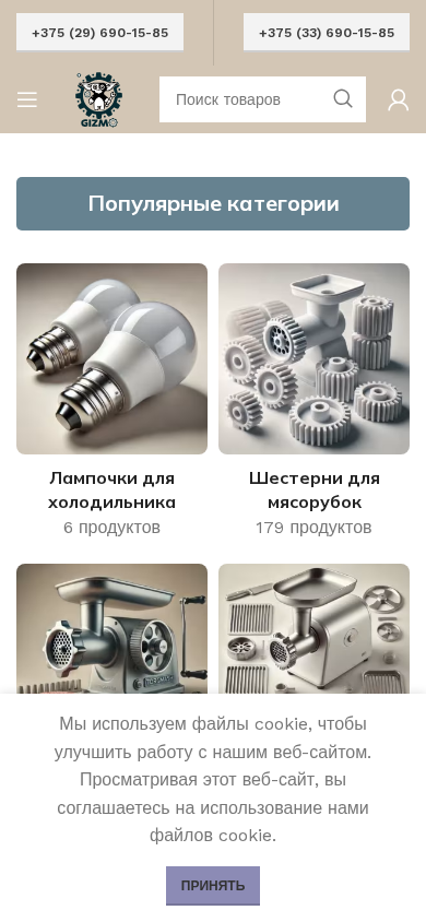 | AI-анализ | The website 'Gizmo' is an online store selling spare parts for home appliances. It has been in operation since 2015 and delivers within Belarus and Minsk. The homepage includes options for quick search, adding items to a wish list, comparing products, and viewing articles. The contact information is provided, including phone numbers for Minsk and Belarus. The main menu offers sections for catalog, discounts, payment and delivery, returns and warranty, and contacts. Popular product categories include parts for refrigerator lamps, mixer shafts, coffee machine parts, and cleaning supplies. The site also features a filter for availability and quick delivery. Some items are noted as being in stock and priced in Belarusian rubles. Delivery within Minsk and all of Belarus starts from 3 BYN. The website allows users to view product details, add items to |