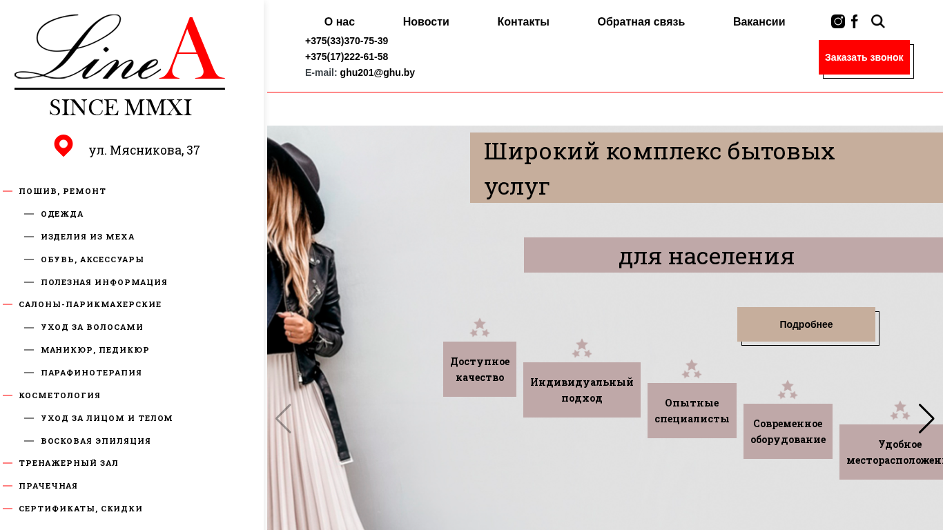 | AI-анализ | The web project "LineA" is a WordPress-based website offering a wide range of lifestyle services for the local population. The website is focused on providing accessible quality and individual approach, with experienced professionals and modern equipment. Services include a shoe repair shop, clothing repair, cosmetology, a tanning room, a salon for wigs and hair extensions, a beauty parlor, a gym, a laundry, and a design and development studio for leggings. The website also features a contact section with phone numbers, email addresses, and an option to request a call back. It is located at ul. Miasnikova, 37. |