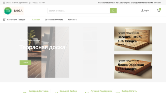 | AI-анализ | --- The website Taiga is an e-commerce platform selling various types of wood products. The title of the website is "Taiga" and the top keywords include "быстрый" (quick), "просмотр" (view), "доска" (plank), "cart," and "лиственницы" (larch trees). The website offers a selection of wooden products such as terrace boards, planks, and various types of boards. The website also mentions quick delivery and a large selection of pilomaterials (wooden materials). The website is based in Kransoyarsk with a representation in Moscow. The contact information provided includes an email address and a phone number. The website offers various options for payment and has a search function. Products are displayed with quick view options and prices. Some products include discounts and free delivery for orders over a certain amount. The website also mentions |