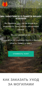 | AI-анализ | This online resource is dedicated to providing grave maintenance services for clients in Minsk and the Minsk region. The website title is "Уборка могил - Уход за могилами" which translates to "Grave Maintenance - Care for Graves". The description includes keywords such as "уборка" (cleaning), "заказать" (to order), "могил" (graves), "захоронения" (burials), "оплата" (payment), "уходу" (care), "банковской" (bank), "цены" (prices), and "бyn" (.BY domain). The top words on the website include "уборка" (nine occurrences), "заказать" (six occurrences), "могил" (four occurrences), and "услуг" (services |