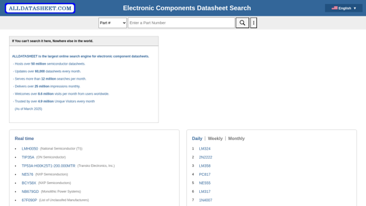 | AI-анализ | The website ALLDATASHEET.COM is a search engine dedicated to providing datasheets for electronic components and semiconductors. It hosts over 50 million datasheets, updating over 60,000 every month, and serves more than 12 million searches and 25 million impressions monthly. With over 8.6 million visits from users worldwide, it is the largest online resource for electronic component datasheets. The search engine allows users to search for datasheets using various markers, including part numbers and manufacturers. Popular searches include transistors, diodes, capacitors, and displays. The website is available in multiple languages, including English, Chinese, German, Japanese, Russian, Korean, Spanish, French, Italian, Polish, Vietnamese, Indian, Mexican, British, and New Zealand English. |