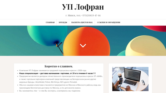 | AI-анализ | The website is for a paint company named УП Лофран located in Minsk, Belarus, with the phone number +375(29)619-47-44. The site's main focus is on selling powder paints, which they have been doing since 2008. They specialize in delivering small quantities, as little as 20 kg, within 6 hours. The company acts as a dealer for the local producer UП «МАВ», and also represents several international brands like AkzoNobel, Pulver, IBA Kimya, IGP, Lypont, and Primatek on the Belarusian market. Their main clients are businesses in Minsk and the surrounding area, as they offer free delivery within the city. Customers can place orders via Viber, and they will receive a response with availability and pricing in the form |