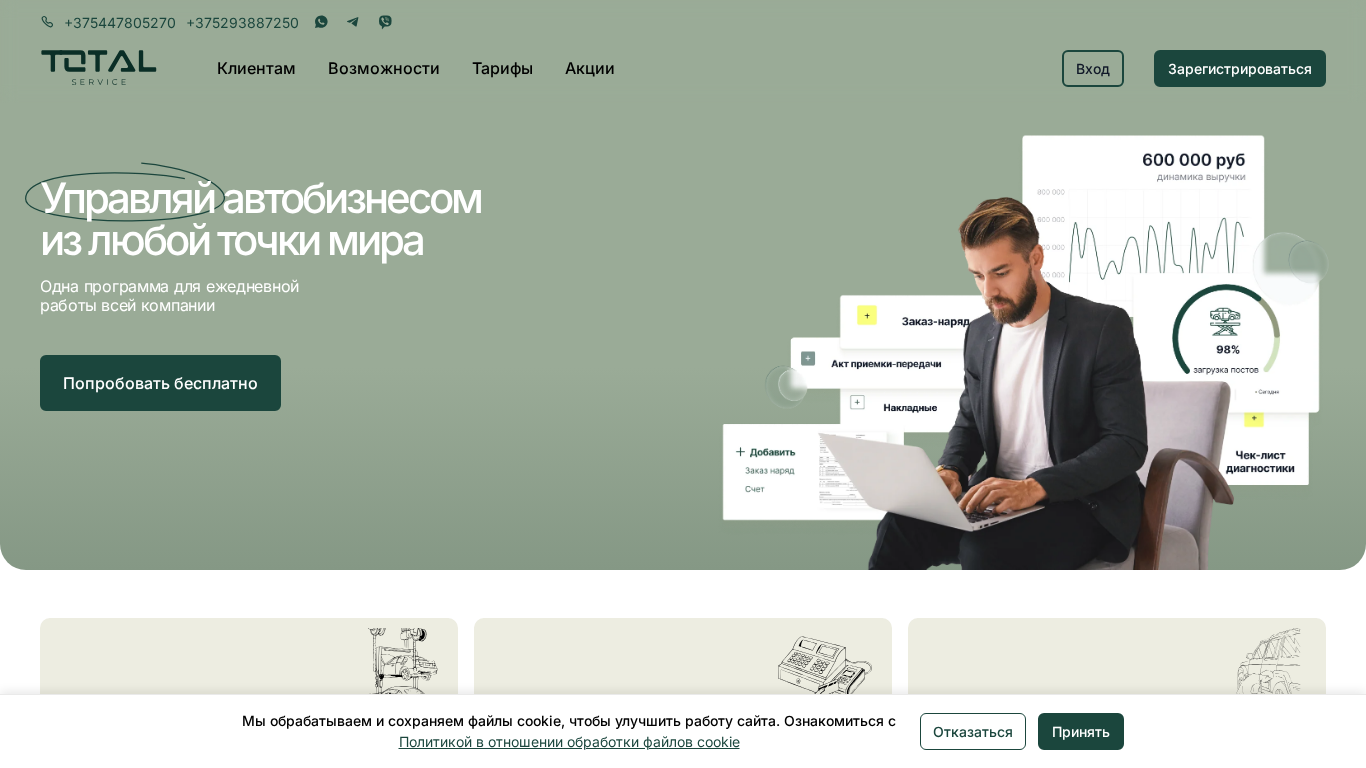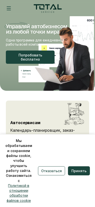 | AI-анализ | The web project Total Service is a software solution for an auto-service and spare parts store. It offers features like print order forms, VIN-based part selection, price lists, labor cost reference, and salary calculation. Users can upload invoices and search for prices. Targeted at clients worldwide, Total Service is a comprehensive tool for daily operations of the entire company. For auto-services, it offers a calendar-planning system, order forms, diagnostic sheets, contracts, labor cost calculation, and an unlimited number of users. For auto-stores, it provides inventory management, CRM, pricing and order placement, export to 1C, price lists, and reporting for effectiveness analysis. Designed for small automotive businesses, it offers document preparation in accordance with regulations, service history tracking, labor time norms, and VIN-based part selection. A free 30-day trial period is available after registration |