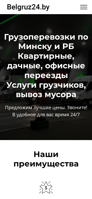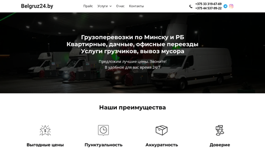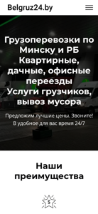 | AI-анализ | This online resource, titled Belgruz24.by, is a pricing and services website for various types of transportation and related services in Minsk, Belarus. The website offers services for apartment, cottage, and office moves, as well as services for loading and unloading trucks, waste removal, and moving labor. Keywords associated with the site include "переезд" (move), "услуги" (services), "грузчиков" (movers), "подробнее" (details), and various measurements and prices. The site offers competitive pricing and punctuality, and prioritizes careful handling and good customer relationships. Services include local and international cargo transport, apartment moves, office moves, cottage moves, moving labor, furniture assembly, and waste removal. The company has been in operation since 2011. |