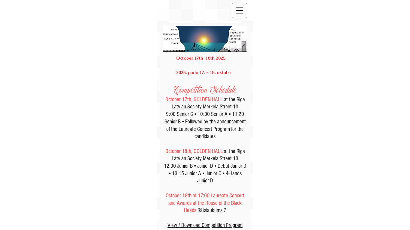 | AI-анализ | The website Competition 2025 | Mysite is dedicated to the 14th Riga International Competition for Young Pianists, scheduled to take place on October 17th-18th, 2025, at the Golden Hall of the Riga Latvian Society, Merkela Street 13. The competition includes categories for Senior and Junior pianists, with subcategories for each level. The schedule consists of performances on both days, with the announcement of the Laureate Concert Program taking place on October 17th. The Opening Concert is set for October 16th at St. Peter’s Church, Riga, and is free for admission. The program features a focus on the works of Latvian composer Jānis Mediņš and his Piano Dainas. Performers for the Opening Concert include Nora L |