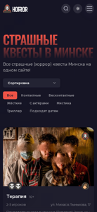 The website Horror.by is a platform for booking horror quests in Minsk, Belarus. It offers various types of horror quests, including contact and beacon-free, immersive, and mystical quests with or without actors. Users can sort the quests by level of fear, contact level, rating, and age. The website provides information about the location, number of players, and a brief description of each quest. Examples include "Who did not hide?" with a rating of 13+ for 2-5 players, "Virus" with a rating of 8+ for 2-6 players, and "Obitel demons" with a rating of 13+ for 1-5 players. The website also includes contact information for booking.