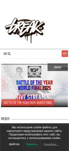 | AI-анализ | ---  The web project Break.by is dedicated to the world of breakdancing. It offers news, videos, championships, interviews, lessons, and music related to this dance style. The site features a top menu with sections for Home, About Us, Schools, Politics, and Privacy Policy. The main content includes videos from various events such as Battle of the Year 2025 World Final, CrashFest, Outbreak Europe 2025, V1 Battle, and Legiteam Obstruxion vs Ruffneck Attack/Doomsday. There are also music sections with mixes by DJ Leg1oner, Khanfu, Fleg & Nobunaga, Soul DJ Smirnoff, Space G & Smirnoff, and interviews with B-Boy CAN/O.P., Bboy Komar, Bboy Slav, and Bboy Physicx. |