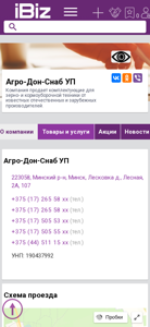 | AI-анализ | The portal Agro-Don-Snab UP is a company selling spare parts for grain and feed processing equipment from well-known domestic and foreign manufacturers. The company's address is 223058, Minsk, Leskovka d., Lesnaya, 2A, 107. Contact information includes multiple phone numbers: +375 (17) 265 58 xx, +375 (17) 265 58 xx, +375 (17) 505 53 xx, +375 (17) 505 55 xx, and +375 (44) 511 15 xx. The company's business hours are Monday to Friday from 9:00 to 17:00, without lunch breaks on |
