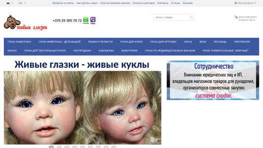 | AI-анализ | --- This online resource is titled "Живые глазки" and is specialized in selling eyes for toys, dolls, decorations, eyes for taxidermy, as well as noses and attachments. The website offers various series of eyes for different types of animals, including mammals, birds, reptiles, and amphibians. There are also sections for special orders and a sale section. The top words on the website include "глаза" (eyes), "серия" (series), "глазки" (eyes), "корзина" (cart), "беларусь" (Belarus), and "cs-cart". The website is available in Belarusian language and accepts orders in rubles and euros. The website includes a FAQ section for questions and answers, information on returns and delivery, and a contact section. The website also features a cart |