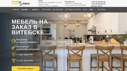 | AI-анализ | The web project "SmailMebel" is a custom-made furniture store based in Vitsebsk, Belarus. They specialize in the production and sale of kitchens, wardrobes, and cabinets with a free 0 RUB measurement and 3D project service, 2-year warranty, and 12 years of experience. The company's showroom is located at pr-t Stryi Teslanav, 11A, TOC "Omega," 1st floor, open from 10:00 to 18:00 on weekdays and weekends. Production takes place at ulicy 39 Armi 54/3, with extended weekend hours. Contact them at +375 29 225-55-92 or +375 29 208-13- |