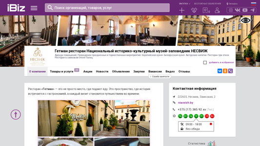 | Название / Заголовок | Гетман ресторан Национальный историко-культурный музей-заповедник НЕСВИЖ - Аренда помещений. Проведение праздничных и торжественных мероприятий. Европейская кухня. Белорусская кухня. Авторские напитки. Ресторан при отеле. Ресторан в замковом отеле Палац.. 222603, Несвиж, , Замковая, 2 |