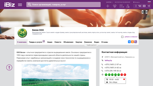 | AI-анализ | This website is for BizON OOO, a company specializing in hops cultivation. The offered hops varieties include Norden Brever, granulated hop, Maglizm, Perle, Clone, Stalter Select, Tettnanger, Saden, Bor, and traditional types. The website includes a map for visiting, contact phone numbers, and the address of BizON OOO, located in 225911, Zaamshany d. |