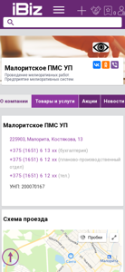 | AI-анализ | The portal malpms.ibiz.by is a business website for Малоритское ПМС УП (Maloritskoe PMS UP), a company specializing in meliorative works and systems in the city of Малорита, Belarus. The website provides information about the company, its location, and contact details, including phone numbers for the accounting, production, and general inquiries departments. The company offers meliorative works, mechanical systems, and construction services. The website also features a section for job vacancies, news, and customer reviews on social media platforms VKontakte and Odnoklassniki. The company's UNP number is 200070167. The website is operated by ООО "АЙБИЗ МЕДИА" - Каталог предприятий и организаций Белару |