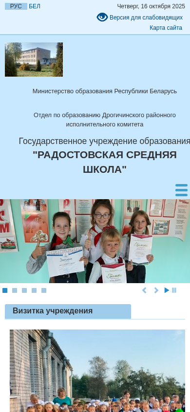 | AI-анализ | The portal "Радостовская СШ" (Radostovo.drogichin.edu.by) is a website for a secondary school in Belarus. The site provides information on the school's administration, schedule, educational programs, and contact details. Keywords associated with the site include "school," "education," "information," "Belarus," and "safety." Top words include "year," "read," "further," "news," and "organizations." The site is operated by the Ministry of Education in the Drogichin District of the Republic of Belarus, and features information on various initiatives, policies, and services related to the school. The site includes sections on academic programs, social support for students, safety measures, and parent resources. The color scheme is standard, with images disabled and text displayed in black and white. The site also includes a link to a |