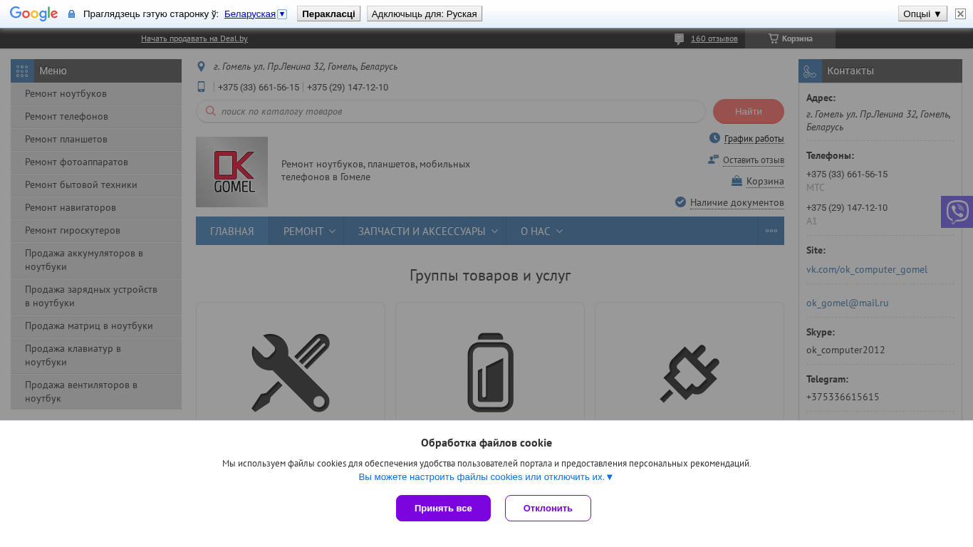 | SEO-описание | Мастерская выполнит ремонт ноутбуков, компьютеров, планшетов, цифровых фотоаппаратов, мобильных телефонов, мониторов и продажу аккумуляторов (батареи) и блоки питания для ноутбуков в Гомеле. |
