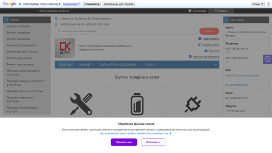 | AI-анализ | The website is a repair and sales service for electronic devices located in Gomele, Belarus. The business offers repair services for notebooks, computers, tablets, digital cameras, mobile phones, monitors, and the sale of batteries and power supplies for notebooks. The contact information for the business includes two phone numbers: 029-1471210 for Velcom and 033-6615615 for MTS. The website also mentions that customers can start selling items on Deal.by and includes a shopping cart feature with 160 reviews. The business is located on Pr. Lenina 32 in Goemeel, Belarus. The services and products offered include the repair of laptops, mobile phones, computers, digital cameras, tablets, PlayStation and Xbox, music centers, and computer assistance. Additionally, the business sells various accessories |