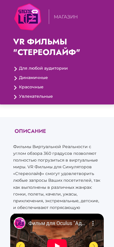 | AI-анализ | --- This website is a virtual reality films store named 'Стереолайф / Магазин'. It offers VR films with a 360-degree angle view for various audiences. The films are categorized into different genres including racing, flying, rollercoasters, horror, adventures, extremes, children's, and provide excellent dynamics. Prices for Belarus are 599, 799, and 999 BYN for three, six, and twelve months respectively. For Russia, prices are 14,900, 22,900, and 30,900 RUB. In Europe, prices are 199, 299, and 399 Euros, and for the US and other countries, prices are 249, 349, and 44 |