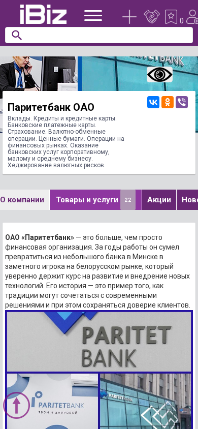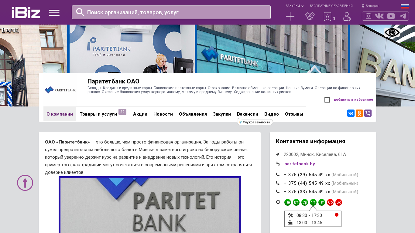 | Название / Заголовок | Паритетбанк ОАО - Вклады. Кредиты и кредитные карты. Банковские платежные карты. Страхование. Валютно-обменные операции. Ценные бумаги. Операции на финансовых рынках. Оказание банковских услуг корпоративному, малому и среднему бизнесу. Хеджирование валютных рисков.. 220002, Минск, Киселева, 61А |