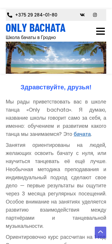 | AI-анализ | This website, titled "Only Bachata – Школа бачаты в Гродно," is a dance school specializing in the teaching and development of Bachata dance. The name of the school implies that it focuses on the education and improvement of which dance? It is Bachata. The lessons cater to individuals who wish to learn Bachata from scratch or to improve their existing skills. An unusual teaching method and individualized approach ensure that students begin to see results within three months of regular attendance. The lessons place significant emphasis on the development of partner interaction and musicality. The course is estimated to last approximately one year. This duration is sufficient to master all aspects of Bachata, given a serious commitment to learning. The atmosphere in the studio is friendly, humorous, and productive. In addition to lessons, events such as parties, open-airs, and outings to nature are organized. The teaching takes place in a spacious hall equipped with |