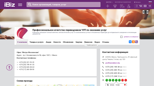 | AI-анализ | This website is a professional translation agency located in the office building "Tivali" at 29 Pritytskogo Street, 5th floor, office 533 in Minsk, Belarus. The agency offers a full range of linguistic services including various oral and written translations, as well as notarization and legalization of documents. The website provides contact information and a map for visitors. The business hours are from 9:00 to 19:00, Monday through Friday, with Saturdays and Sundays being holidays. The phone numbers are +375 (29) 140 38 xx, +375 (29) 285 78 xx, +375 (25) 600 28 xx, and +375 (17) 248 |