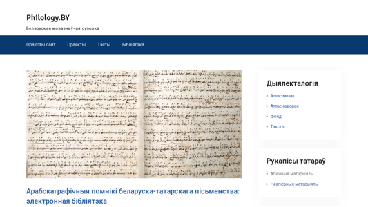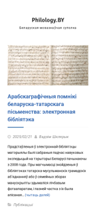 | AI-анализ | The web project Philology.BY — Беларуская мовазнаўчая суполка (Belarusian Philology Institute) is a website dedicated to Belarusian language and culture. It features various projects, tests, and a library. The website contains electronic collections of materials related to the study of Arabic scripts in Belarusian-Tatar writing. These materials were collected during scientific expeditions on the territory of Belarus since 2008. Some of them were discovered in the archives of Tatar-Muslim communities or in family collections and photographed with digital cameras. Other publications on the site include texts, manuscripts, and translations in various fields such as Belarusian studies, Slavic studies, and the history of linguistics and philology. The site also features biographies and news related to notable figures in the field of Belarusian language |