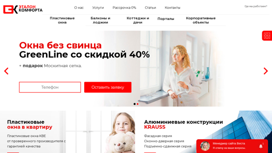 | AI-анализ | --- The website is for a window manufacturing and installation company named Etalon Group, specializing in PVC and aluminum windows. They offer their products in various cities including Mogilev, Minsk, Grodno, Vitsebsk, Brest, and Homel. Customers can contact the company through two phone numbers, one for Mogilev and another for general inquiries. The website also mentions services like professional installation, warranty service, and credit options. The company produces various types of windows for residential and corporate buildings, balconies, and greenhouse structures. Keywords suggest windows, Krauss profile, price, order, plastic, PVC, aluminum, installation, warranty, credit, and various city names. |