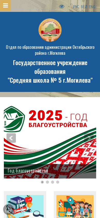 The website is for Middle School No. 5 in the city of Mogilev, Belarus. It provides information about the school, its news, schedule, and various educational and administrative matters. The title of the website is "Middle School No. 5 Mogilev" and it includes sections on the school's history, traditions, achievements, educational programs, sports, and various documents and regulations. The website also features information on the school's disabled services, contact information, and a library. The domain is school5mog.by.