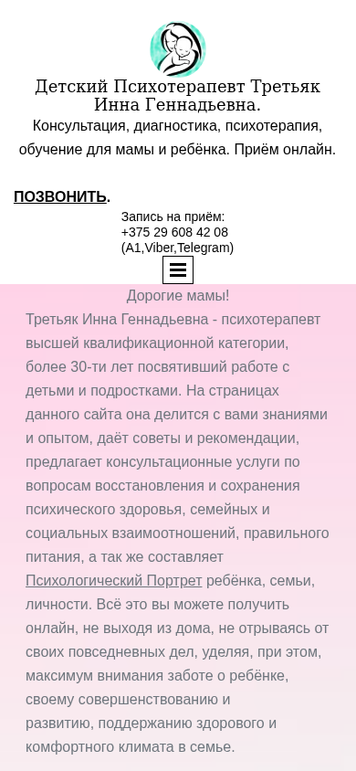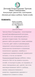 | AI-анализ | --- The web project "Infomama.by" is a website dedicated to providing consultations and services related to child psychology, therapy, and nutrition. The project is run by a child psychotherapist named Inna Tretyak, who has over three decades of experience working with children and adolescents. The site offers various services, including online consultations, psychological assessment, and therapy sessions. Visitors can also access articles, videos, and a contact page to make appointments. The site's top words suggest that it also provides recommendations, support, and education for mothers and families. The website is available in Belarusian .BY domain. |